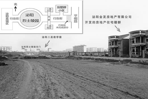 從空間位置上看,由金發(fā)房地產開發(fā)公司所建的住宅樓在烈士陵園東側約1公里的地方,中間間隔了泌陽縣第二高中校園。住宅樓及別墅區(qū)并沒有侵占烈士陵園土地。