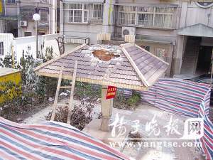記者在該小區(qū)看到,一架爬梯搭在涼亭頂部,廢磚石塊散落一地,周圍用帆布圍起來(lái),涼亭頂部露出兩個(gè)直徑約一米寬的大窟窿,柱子底部已經(jīng)被人鑿出凹面。該小區(qū)物管公司負(fù)責(zé)人對(duì)記者說(shuō),涼亭是上個(gè)月下旬被小區(qū)一姜姓女業(yè)主砸毀的,帆布和告示牌都是她設(shè)置的!凹依锇l(fā)生一連串怪事,后來(lái)聽人說(shuō)都是因?yàn)檫@個(gè)涼亭壞了風(fēng)水!38歲的姜女士對(duì)記者說(shuō),前年4月份她在該小區(qū)買了現(xiàn)在居住的房子!叭ツ8月份,小姑子12歲的兒子,星期天外出開電瓶車,出了交通事故,把腿撞斷了,一年后才把腿傷治好。還有去年丈夫在上海做廢鋼生意,虧了幾百萬(wàn)元。另外,我有心臟病,身體一直不好……”姜女士說(shuō),一連串的不幸讓她心情變得壓抑。后來(lái),她聽人講,小區(qū)里的涼亭正好對(duì)著她家陽(yáng)臺(tái)的窗戶,壞了家中風(fēng)水。于是,她于2月24日喊人把小區(qū)涼亭砸了。