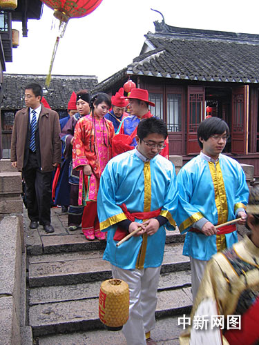 今天一早,古鎮(zhèn)周莊已是人頭攢動,張廳、沈廳張燈結(jié)彩。良辰吉時一到,長衫、馬褂、禮帽打扮的新郎駕著鑼鼓震天的迎親船由水路駛來,吸引著河兩岸的游人來回奔走爭睹。隨后紅蓋遮面、身著花衣花衫、足蹬繡花鞋的新娘出閣、上花船、搖快船、拜堂、鬧洞房、走三橋、喝喜茶、夫唱婦隨“雙推磨”……熱鬧的水鄉(xiāng)婚禮吸引了無數(shù)游人擠身觀賞,小情侶們更是眼紅心讒。