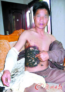 備受社會(huì)關(guān)注的手機(jī)爆炸事件再次在韶關(guān)上演。一名乘坐摩托車的男子腰間突然發(fā)生爆炸,被強(qiáng)大的沖力掀倒在地上的他身上燃起了大火還渾然不知發(fā)生了何事,最后才發(fā)現(xiàn)始作俑者原來是自己腰間懸掛的手機(jī)。昨天上午,記者在韶關(guān)市武江區(qū)重陽鎮(zhèn)見到了全身滿是傷痕的機(jī)主林先生。