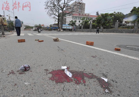 記者趕到現(xiàn)場(chǎng)時(shí),老人剛被送往醫(yī)院,路面上滿是血跡。警方正在用磚頭圍著的事故現(xiàn)場(chǎng)勘查。“當(dāng)時(shí)那名老人從分院走出來(lái),過(guò)斑馬線時(shí),一輛摩托車從他后面撞了上去。”一目擊者說(shuō),那輛“黑色,很新”的摩托車速度很快,“老人被撞得飛起,在地上滾了幾下,躺在路上呻吟著,頭上、腳上都是血。”