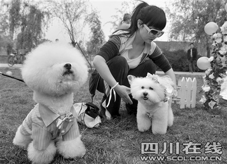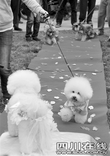 昨天下午3點(diǎn),成都非物質(zhì)文化遺產(chǎn)國家公園內(nèi)響起了結(jié)婚進(jìn)行曲,正當(dāng)市民們駐足想看下新人的模樣時,兩只白色的比熊犬身穿鮮艷禮服走上紅地毯,突然闖進(jìn)大家的視野。原來,它們就是這場婚禮的主角。13套豪華禮服,紅毯花房,“狗友”證婚還有入洞房等等,一樣都不能少。主人請人專門為狗狗策劃、舉行這么隆重的婚禮,數(shù)百在場市民對此褒貶不一……