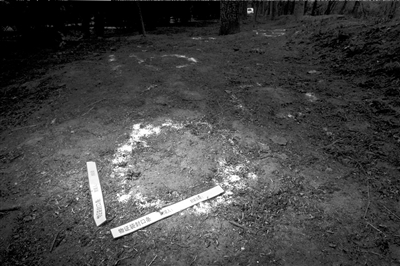 昨天上午在事發(fā)現(xiàn)場,警方勘察時撒的石灰粉清晰可見,一些物證袋封存條遺留在地上。在圍墻附近東西走向的灌木叢中,記者看到一處新翻的土堆,土堆上有兩處血跡。