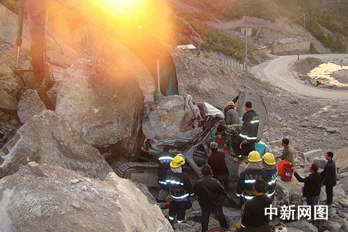發(fā)生滑坡事故地點位于上屋采石場的半山腰,消防隊員攜帶破拆工具徒步上山。在現(xiàn)場,挖掘機被兩塊巨大的石頭壓得面目全非,駕駛室已被壓得完全變形。一名40多歲的司機被牢牢壓在駕駛室內(nèi),為防止再次滑落,幾名工人用鋼釬將巨石牢牢頂住。