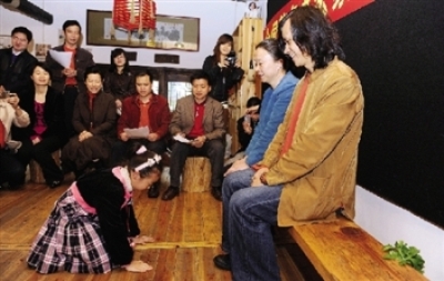 曾先生(市民):我認(rèn)為這是一種文化的回歸,一種民族自我的回歸。行跪拜之禮,不在于形,但可以通過形式對(duì)中國古代經(jīng)典文化進(jìn)行繼承。這種跪拜之禮,有人可能會(huì)說它是糟粕,但是,是否糟粕,誰來定論?為什么跪拜之禮就是糟粕?現(xiàn)在好多地方過年時(shí),晚輩給長(zhǎng)輩拜年也是跪著的呢。