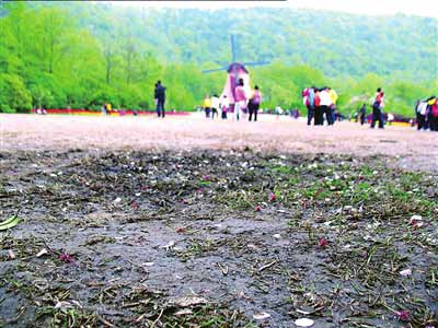 杭州市園林文物局花港管理處辦公室主任馮剛說,按太子灣的規(guī)模,人數(shù)超過1.1萬人次就要啟動應(yīng)急預(yù)案,但清明節(jié)3天游客數(shù)量超過20萬人次,70%是外地游客。為防止意外,疏散人群,公園只能把觀賞草坪開放。后果是一半草坪被損,成片草坪被踩成黃泥地,游客為了拍照,踩踏、搖落的觀賞花不計其數(shù)。