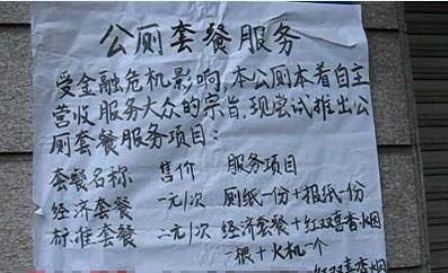 據(jù)悉,告示上將該項服務分為五個等級,分別是經(jīng)濟套餐、標準套餐、商務套餐、豪華套餐、總統(tǒng)套餐。每個套餐還列出了各自的服務項目。例如經(jīng)濟套餐就贈送廁紙一份、報紙一份,收費也相當?shù)土瑑H僅需要一元;2元的標準套餐則在經(jīng)濟套餐的基礎上送出紅雙喜香煙一根火機一個。最雷人的應該算是價值10元的豪華套餐,竟然有專業(yè)陪聊的服務項目。而20元的總統(tǒng)套餐也讓人摸不著頭腦,居然包括彩票一張和精美紀念冊。這些都讓網(wǎng)友們好奇不已:不知道當你如廁的時候,有人在一旁陪你談心,會是什么樣的感受?而精美紀念冊的內容,又會是什么?