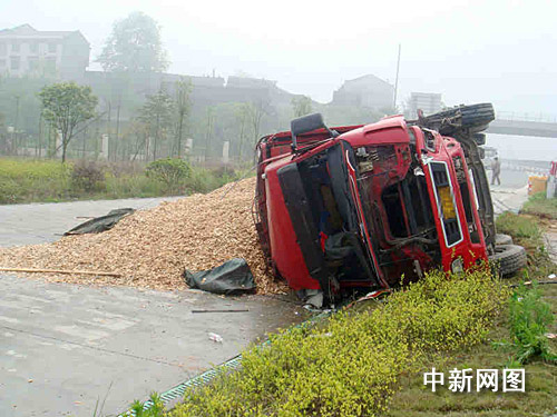 中新網(wǎng)長沙4月17日電(雷坤平 肖前輝)17日上午,一輛超載的大貨車在駛?cè)肷?陽)懷(化)高速公路安江服務(wù)區(qū)時,因駕駛員疲勞駕駛操作失誤,導(dǎo)致大貨車側(cè)翻在服務(wù)區(qū)入口處。