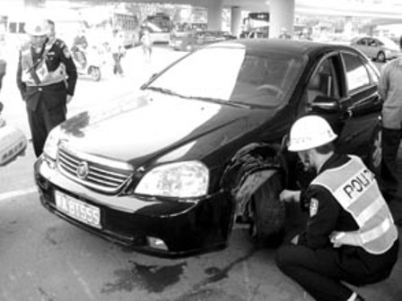 見狀,行人欲上前堵截,小車司機卻打正方向繞至北面正常車道。目擊者張先生說,當(dāng)時路邊還停著一輛警用摩托,可小車司機就像昏了頭,居然還徑直往上撞。隨后倒車又撞向一處橋墩,最后車輛因輪胎爆裂被迫停下。