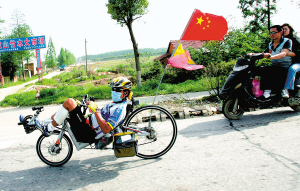 由于不好打擾騎車人的“騎興”,記者只能在與其短暫并行時(shí)了解到,他來自北京,準(zhǔn)備就這樣一直騎到深圳。問起他在武漢境內(nèi)的騎行的感覺,他高高豎起了大拇指。記者與他分手繼續(xù)做了相關(guān)采訪,才知道這位北京哥們兒可不是什么“怪物人”,他的座駕的專業(yè)名稱叫“躺車”,在國(guó)外已經(jīng)風(fēng)靡了近一個(gè)世紀(jì),擁有了一大批愛好者!疤绍嚒卑l(fā)力依靠的是腳力和腰力,比一般的自行車更省力、更舒服。一輛高質(zhì)量的“躺車”至少也要1200美元。如今國(guó)內(nèi)各地也開始出現(xiàn)不少“躺車”發(fā)燒友,他們大多自己DIY,還成立了聯(lián)誼會(huì),開展專業(yè)比賽呢。(記者張寧)