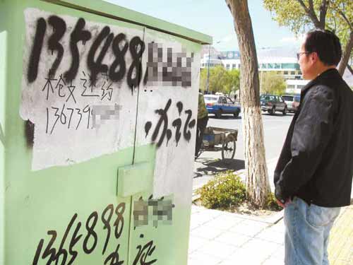 住在娘熱路附近的卓女士告訴,一些涂寫(xiě)非法小廣告的人都是趁天黑或早上人比較少的時(shí)候伺機(jī)作案。他們這些人就是和管理部門(mén)‘打游擊’,很難被抓住!弊颗扛嬖V記者,拉薩是自治區(qū)的首府城市,而娘熱路是我市的一條主要干道,違法分子到處亂涂亂寫(xiě)非法廣告嚴(yán)重影響了市容市貌,出售“槍支迷藥”的非法小廣告出現(xiàn)在城市中心地帶更會(huì)讓內(nèi)地游客擔(dān)心拉薩的社會(huì)治安,從而給拉薩的經(jīng)濟(jì)社會(huì)發(fā)展帶來(lái)不小危害,希望有關(guān)部門(mén)進(jìn)一步加大工作力度,狠狠打擊這些違法分子。