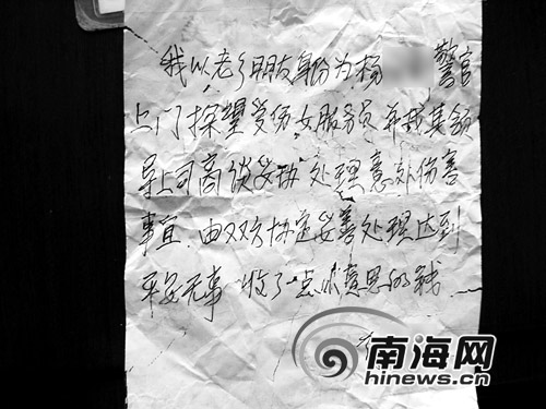 楊警官要求蔡某寫下一張收條,蔡某當(dāng)場(chǎng)寫道:我以老鄉(xiāng)朋友身份為楊警官上門探望受傷女服務(wù)員,并找其領(lǐng)導(dǎo)上司商談妥協(xié)處理意外傷害事宜,由雙方協(xié)定妥善處理達(dá)到平安無事,收了一點(diǎn)小意思的錢。
