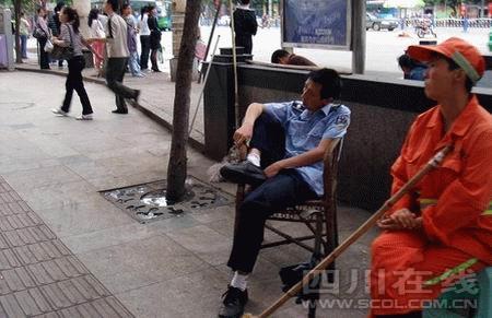 昨日,照片里的主角,宜賓市翠屏區(qū)市容管理局南城中隊(duì)協(xié)管員李劍勇表示,單位領(lǐng)導(dǎo)已批評(píng)教育他了,自己影響了宜賓和宜賓城管的形象,他表示非常抱歉!爱(dāng)時(shí)所有的攤點(diǎn)都已規(guī)范位置了,想坐著休息下!崩顒τ抡f(shuō),城管協(xié)管員沒(méi)有固定工作點(diǎn),他便在游攤最易出現(xiàn)的南門橋頭坐著休息會(huì)兒,他希望所有的城管隊(duì)員都將他作為反面教材,在以后的工作中注意紀(jì)律和形象。