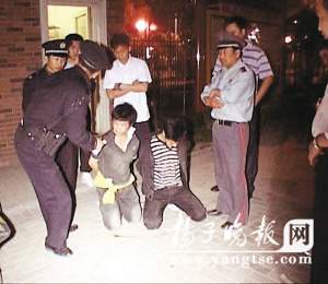 記者趕到現(xiàn)場時(shí),兩名年輕男子雙手被反綁,跪在小區(qū)門口不敢動彈,他們的臉上有多處傷痕。兩名男子四周站滿了小區(qū)業(yè)主,面對大家的指責(zé),他們低下了頭,不斷求饒,讓大家放他們一馬。據(jù)一名小區(qū)保安介紹,當(dāng)晚,他和另外一名保安在門衛(wèi)室值勤。到了9點(diǎn)半時(shí),他發(fā)現(xiàn)兩名陌生男子推著一輛自行車從小區(qū)內(nèi)走來,兩人還邊走邊四處張望。他覺得對方可疑,當(dāng)即喊上一名同事上去盤問。經(jīng)盤問,兩名男子并不是小區(qū)業(yè)主,也無法說出來小區(qū)的目的,對于自行車的來歷,更是支支吾吾。細(xì)心的保安發(fā)現(xiàn)自行車鎖有明顯被撬痕跡,當(dāng)即斷定兩人是偷車賊,于是,當(dāng)場將這兩人按倒,同時(shí)呼叫其他保安增援。小區(qū)業(yè)主孫先生說,兩名偷車男子被揪住后不一會兒,就哭著求饒了,并主動承認(rèn)他們是來小區(qū)偷自行車的,也表示將自行車歸還,希望保安放他們一馬。兩保安見那兩男子服軟了,才停手,但他們沒有立即報(bào)警,而是找來繩子將兩名男子雙手反綁在背后,然后脫去他們的鞋子,逼迫他們跪在門衛(wèi)室門口。