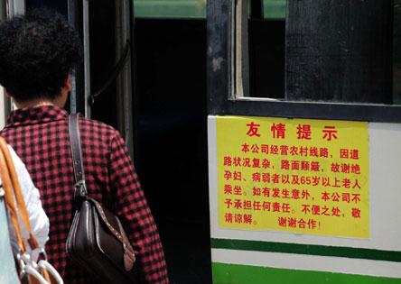 在新店至北峰客運專線班車上,記者看到,車門上或者車內(nèi)并未張貼類似的提示或免責條款,沿途也不時有老人乘車。
