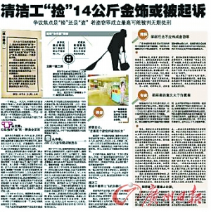 連日來(lái),本報(bào)(廣州日?qǐng)?bào))率先報(bào)道的《清潔工“撿”14公斤金飾或被起訴》在社會(huì)上引起了極大爭(zhēng)論,尤其在法律界產(chǎn)生震動(dòng),中國(guó)律師網(wǎng)在網(wǎng)頁(yè)頭條討論該案,國(guó)內(nèi)很多著名律師對(duì)該案發(fā)表了評(píng)論。