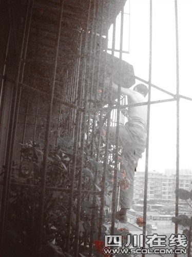昨日早上6點(diǎn)過,成都站北東路144號(hào)居民陳先生被一陣嘈雜聲驚醒,“有賊娃子上來了!”樓下掃地的萬婆婆大聲呼喊。陳先生走出臥室,赫然發(fā)現(xiàn)書房的防護(hù)欄外,站著一個(gè)身穿黑色外套的中年男子……