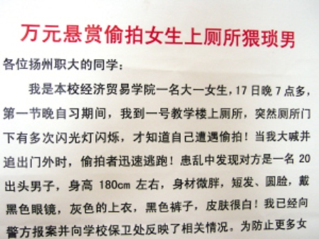 18日,一張張名為《萬元懸賞偷拍女生上廁所的猥瑣男》的“懸賞啟事”,張貼在了揚州職業(yè)大學(xué)校園內(nèi),吸引了該校師生的注意。記者看到,“懸賞啟事”標(biāo)題的字體和顏色都格外醒目,內(nèi)容為一位大一女生遭遇偷拍的經(jīng)歷!拔沂潜拘=(jīng)濟貿(mào)易學(xué)院一名大一女生,17日晚7點多,第一節(jié)晚自習(xí)期間,我到一號教學(xué)樓上廁所,突然廁所門下有多次閃光燈閃爍,才知道自己遭遇偷拍!……我已經(jīng)向警方報案并向?qū)W校保衛(wèi)處反映了相關(guān)情況。為防止更多女生受侵害,早日將這種性變態(tài)的人繩之以法,我個人出10000元懸賞知情人提供有價值線索!庇浾咦⒁獾,“10000元”的字體很大,而且是紅顏色,格外惹眼。啟事最后還寫著“捍衛(wèi)女生權(quán)益,和偷拍斗爭到底”的字樣。