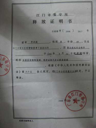 但是,對于江門日報刊登的報道,一名網(wǎng)友給本網(wǎng)提供了《行政處罰決定書》的圖片,在該圖片上可以清楚地看到,決定書上寫著“現(xiàn)查明2008年9月16日,違法嫌疑人……因?qū)T市荷塘鎮(zhèn)土地使用問題不滿,意圖到北京上訪。我民警根據(jù)此線索,于2008年9月24日10時許,在車站抓獲五名涉嫌煽動串聯(lián)、以財務(wù)誘使他人信訪,擾亂國家機關(guān)正常工作秩序的嫌疑人”,在決定書下方有被處罰人簽名和指模,以及江門市公安局蓬江分局蓋印。該名網(wǎng)友同時提出質(zhì)疑,聲明摘錄如下: