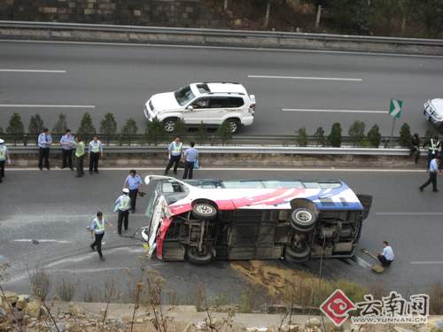 18日下午1點(diǎn)45分,安楚高速公路昆明至楚雄方向K128+500米處(孔家莊隧道出去1公里)發(fā)生一起重大交通事故,一輛從下關(guān)開往昆明載有29人的中型客車發(fā)生側(cè)翻,當(dāng)場死亡1人,28人受傷,其中重傷1人。事故發(fā)生后,交警部門對(duì)楚雄至昆明方向的高速路實(shí)施了封閉,記者去現(xiàn)場只能從320國道繞行至山上的小路,站在在距離事故現(xiàn)場約30米的山坡上,記者看到在開往昆明方向的高速路上,一輛客車側(cè)翻在路中間,雖是開往昆明方向,但車頭卻調(diào)轉(zhuǎn)了朝著相反方向。凹陷的車頭上,擋風(fēng)玻璃像蜘蛛網(wǎng)一樣滿是裂痕,右側(cè)有個(gè)很大的窟窿,車身旁邊一道長長的劃痕非常明顯,車身下漏了一大灘汽油,一塊標(biāo)有大理兩個(gè)字的白色牌子飛到了距離客車有5、60米的地方。這時(shí)交警部門正在做現(xiàn)場勘查,在汽油上散上了沙子。 “嘭”,我當(dāng)時(shí)聽到一聲巨響,跑出來一看,就看見一輛客車翻在坡底的高速路上,有個(gè)人被甩出了車外躺在地上一動(dòng)不動(dòng),其他的乘客在車上哭的哭,喊的喊。”高速路旁的楚雄大瓦房村的一位村民目睹了車禍時(shí)的情景。附近一位路過的駕駛員猜測說,從擋墻在撞擊的痕跡上看,客車可能是撞上可擋墻后,又反彈回來,駕駛員急忙打方向盤,車子就來了個(gè)360度大轉(zhuǎn)身后翻倒在地!斑@段路過了隧道后,因?yàn)槭窍缕侣范,不少大車司機(jī)踩剎車時(shí)會(huì)不停地淋水,所以路面比較滑,司機(jī)車速稍一快就容易出事!