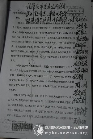 “請(qǐng)綿陽(yáng)市委辦公廳轉(zhuǎn)告吳加勤同志,來(lái)信及承贈(zèng)郵冊(cè)均已收到,十分感謝。謹(jǐn)向她和她幸存的家人表示親切的問(wèn)候,向陳家壩所有的父老鄉(xiāng)親表示良好的祝愿。附一簽名的紀(jì)念封。溫家寶 五月十七日”。(楊亦萱)
