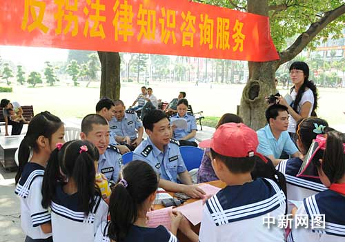 在北部灣廣場(chǎng),北海市公安局?jǐn)[設(shè)的“反拐”法律知識(shí)咨詢服務(wù)臺(tái)前,一群小朋友把桌子團(tuán)團(tuán)圍住,就有關(guān)防拐知識(shí)認(rèn)真的向民警咨詢起來。小朋友的問題貼近實(shí)際,民警的回答則詳細(xì)易懂。通過交流,民警將一些易于操作、實(shí)際效果明顯的反拐知識(shí)教授給小朋友們。