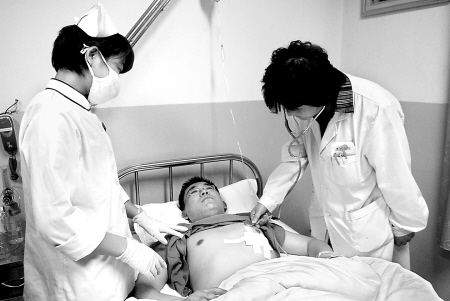 昨天晚上,記者聞?dòng)嵑笱杆仝s到西京醫(yī)院,在急診科三樓的病房里,急診外科的醫(yī)生朱金文躺在病床上,他的左側(cè)胸部上貼著一大塊白色的紗布,胳膊扎著一根針管正在輸液。據(jù)目擊者說(shuō),下午4時(shí)許,一名五十多歲的病人在幾個(gè)人的陪同下來(lái)到急診外科就診,說(shuō)是在交通事故中受了傷。醫(yī)生就開(kāi)始給病人做檢查,可病人的手一直捂著胸部,拒絕檢查。此時(shí),不知何因,病人打了醫(yī)生兩拳。醫(yī)生并未發(fā)火,隨后停下檢查,過(guò)了一會(huì)兒又過(guò)去查看病人。病人突然情緒失控,拿出一把小刀朝醫(yī)生胸部捅去,醫(yī)生趕緊用手壓住傷口跑到急救室。