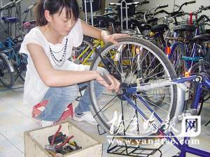 在無錫商業(yè)職業(yè)技術(shù)學(xué)院創(chuàng)業(yè)教育園里面有一家“奇·騎車行”,主營自行車租賃和維修,在整個藕塘職教園區(qū)都很有知名度。讓人想不到的是,這家車行的“主人”竟然是一名23歲的在校女大學(xué)生,一位自行車的維修高手。昨天,記者在學(xué)校里見到了這位來自連云港的大三女孩姚莉娟。小姚給人的第一印象就是身材高挑,漂亮大方,大學(xué)生美女這些詞匯怎么也和修車掛不上關(guān)系。自從愛上修車之后,她整天和油污、機械打交道,靠著自己的勤勞和智慧,被大家稱為大學(xué)里的最美“修車匠”。