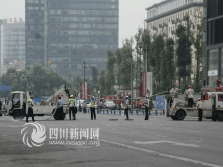 記者在現(xiàn)場(chǎng)未見到救護(hù)車輛,F(xiàn)場(chǎng)有近10輛消防車,交警正在疏導(dǎo)交通,成都主干道人民南路二段交通并未中斷。