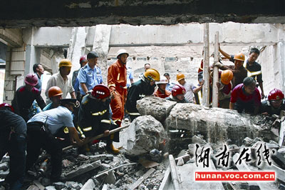 9時50分,湘潭市雨湖、特勤兩個消防中隊火速趕赴現(xiàn)場,當時已有一名被困者被成功救出,另有一名民工的下半身被死死壓住,動彈不得;其上半身被砸得遍體鱗傷,胸口正好卡在斷裂的房梁下,血流不止。