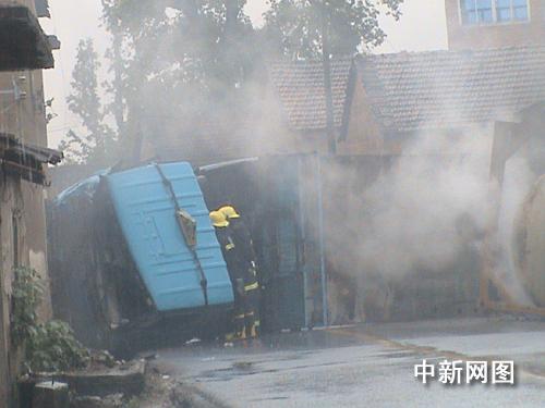 消防隊(duì)員趕到現(xiàn)場(chǎng)時(shí),只見一輛槽罐車側(cè)翻橫在村道中間,車頭部將右邊車道旁的兩間房子撞了兩個(gè)大窟窿,整個(gè)槽罐已脫離車身,躺在路邊水溝內(nèi),泄漏的硫酸不斷流入旁邊的水溝,冒出白色的煙霧,空氣中充滿了刺鼻的味道,幾百米外都能聞到。消防隊(duì)員在現(xiàn)場(chǎng),明顯感到喉嚨干澀,許多村民用毛巾、衣角捂住口鼻,退至安全地帶。