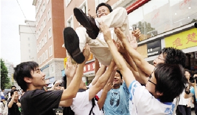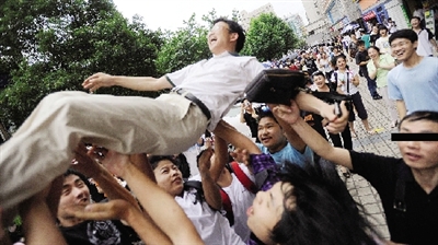 高考最后一門英語結束了,對緊繃的高三學生來說,這是一個歡樂的時刻,輕松的時刻。周南中學十幾名高三學生,剛走出長沙一中考點,便將班主任吳老師舉起拋向了空中。