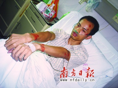昨日下午,記者趕到三水區(qū)人民醫(yī)院住院部,傷者韋奕慶正躺在病床上打吊針,他鼻子里插著氧氣管,左額、太陽(yáng)穴、眼角及下巴等多處涂著紫藥水。