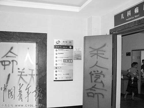自從李醫(yī)生逃脫后,死者家屬便每天到醫(yī)院示威。據(jù)院方提供的材料,6月29日,死者家屬聚集40余人在醫(yī)院門診、急救中心大廳燃放鞭炮、焚香、燒紙錢、擺放花圈,堵塞急救中心車輛通道,阻礙120急救車輛進(jìn)出,在門診部、急救中心電梯口、墻壁等處噴灑黑漆,寫上“殺人償命、還我女兒”等字;6月30日,死者家屬再次聚集20余人在醫(yī)院急救中心大廳燃放鞭炮,急診科搶救室有大量的氧氣瓶和各種搶救設(shè)備,萬一引起燃燒或爆炸,后果不堪設(shè)想;7月1日,死者家屬在門診大樓外拉橫幅,放鞭炮,將紙錢拋撒進(jìn)收費(fèi)處窗口。院方說,這種聚眾鬧事的行為,嚴(yán)重干擾醫(yī)院正常診療秩序,搞得醫(yī)務(wù)人員人心惶惶,無法安心工作。院方認(rèn)為,死者家屬不愿通過正常渠道解決問題,并拒絕尸體解剖,“企圖通過鬧事來擴(kuò)大事端,給醫(yī)院造成負(fù)面影響,對醫(yī)院施加壓力,從中牟取經(jīng)濟(jì)利益”。
