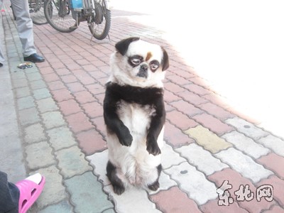 兩只拳頭大小的黑眼圈,短小的黑耳朵,圓圓的臉,肥身體,四肢及胸部為黑顏色,其余毛色均為白色。從遠處慢騰騰的走過來,人們都以為這是一只憨態(tài)可掬的小熊貓?墒聦嵤,這是一只被主人染成熊貓模樣的小狗。