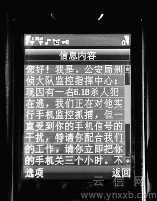 “您好!我是公安局刑偵大隊(duì)監(jiān)控指揮中心:現(xiàn)因有一名6.18殺人犯在逃……請(qǐng)你立即關(guān)閉手機(jī)三小時(shí),否則拘留七至十五天!苯拥竭@樣的短信后,岳代林相信了,關(guān)閉了手機(jī)。然而發(fā)短信的人卻利用他關(guān)電話(huà)的空當(dāng),向他身在四川的家屬謊報(bào)他出了“車(chē)禍”。然而假的真不了,再高明的騙局遲早也要“露餡”。