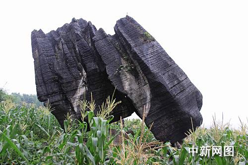 記者在長寧縣梅硐鎮(zhèn)中坪村看到,這兩塊“奇石”緊緊依偎連在一起,巋然不動(dòng)地聳立在一塊玉米地中間的石灰石上,成60多度角向南傾斜;每塊“奇石”高10米左右,周長在12米以上;“奇石”底部與地面出露的石灰石基巖并未“生”在一起,而是像放在上面一樣。南(左)面的那塊石頭要“矮胖”些,與地面有兩個(gè)接觸點(diǎn);北(右)面的則“苗條”些,與地面只有一個(gè)接觸點(diǎn)。