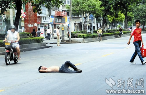 事發(fā)昨日正午,記者在漢陽郭茨口看到,一名男子上身裸露,手提一袋醫(yī)院的病歷資料,情緒激動(dòng)地躺在馬路中央,脊背被路面燙得通紅。此時(shí)路面車流不息,該男子處境十分危險(xiǎn)!翱彀阉貋!”幾名路人見狀后,靠近該男子,欲將其拉到路邊,但該男子并不領(lǐng)情,堅(jiān)決不起身。幾分鐘后,二橋派出所的民警趕來,要求該男子去派出所再說,該男子置之不理。民警表示,早8時(shí)許和10時(shí)許,該男子曾在附近路面躺過兩次,都被他們帶回了派出所,他們這已是第三次為該男子出警。“有什么委屈就說出來,那樣心里痛快點(diǎn)!币娒窬譄o策,熱心路人們開始輪番上前勸解。眾路人汗流浹背,頂著烈日站在馬路中央,對(duì)該男子動(dòng)之以情、曉之以理。半小時(shí)后,該男子陸續(xù)說出了心中的不快。又經(jīng)勸解,該男子終于答應(yīng)跟民警回派出所,將事情說清楚。