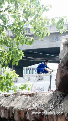 停車場的上面就是鄂黃大橋,記者繞行來到橋上面。剛找準(zhǔn)位置停下,就看見一輛車身上印有“中國石油”的油罐車駛?cè)胪\噲觥<s5分鐘后,一名光著上身的男子開著三輪車駛?cè),車上裝著幾個大的空塑料油桶和一根塑料油管。油車司機迎了上去,并把三輪車停在油車的一側(cè)。約十分鐘后,三輪車駛出停車場,塑料桶內(nèi)已裝滿汽油。
