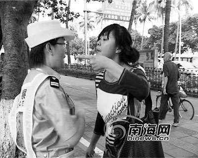 當(dāng)天下午4點(diǎn)45分,22歲女大學(xué)生小蕊走出銀龍影城橫穿6個(gè)車道后,在首力大廈被現(xiàn)場執(zhí)勤的?诮痪瘮r下。當(dāng)交警告知她,翻越護(hù)欄橫穿馬路屬于交通違法行為需接受處罰時(shí),小蕊聲稱自己是第一次,身上也沒帶錢,隨后便開始“發(fā)飆”了!澳闼龐尩膞x,我x你媽!边@名女大學(xué)生開始對交警進(jìn)行辱罵。?谑薪痪ш(duì)一名負(fù)責(zé)攝像的工作人員對這一過程進(jìn)行錄像時(shí),女子一把抓過攝像機(jī)準(zhǔn)備砸在地上時(shí),被交警及時(shí)制止,“你要是砸了錯就更大了”。