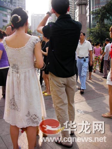 記者在觀音橋步行街就發(fā)現(xiàn),上午來(lái)廣場(chǎng)上看日全食的情侶還真不少,大家都有備而來(lái),準(zhǔn)備好相機(jī)和日全食觀測(cè)鏡,記錄下浪漫的一刻,甚至有的情侶還帶上家里的小寵物,共同關(guān)注日月同輝。