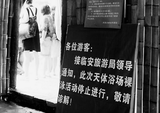 一位男游客率先發(fā)現(xiàn)了公告牌—— “各位游客:接臨安旅游局領(lǐng)導(dǎo)通知,天體浴場裸泳活動停止進行,請各位原諒!”