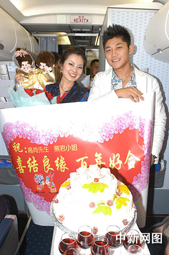 東航江蘇公司客艙部獲悉這一信息后,乘務(wù)長潘忠威花費(fèi)了一天的時間購買鮮花、香檳酒、布娃娃玩具、云錦禮品等,并且還特意設(shè)計制作了祝賀圖版,上面寫有“喜結(jié)良緣,百年好合”。