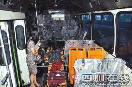 試驗開始前,記者在試驗現(xiàn)場打探了一番:試驗車是一輛綠色的CFC6110D型公交車,正是與成都“6·5”公交燃燒事件同類又同色的車型。車廂頂棚夾層內(nèi),記者看到安置了一根管道,管道上有幾個噴霧龍頭狀的裝置,過道地上特別放置了一些木柴垛和衣物。特別的是,在左側(cè)倒數(shù)第二排的座位,即縱火嫌疑人事發(fā)時所坐的位置,試驗人員放置了試驗用的唯一動物活體——一只后腿捆綁、放在長方形紙盒里的兔子,車廂內(nèi)均勻地傾倒了汽油。在汽車的頭尾部,數(shù)十根控制、驅(qū)動線連接到控制臺處,一場完全按“6·5”公交燃燒事件9路公交車事發(fā)場景的試驗即將開始。