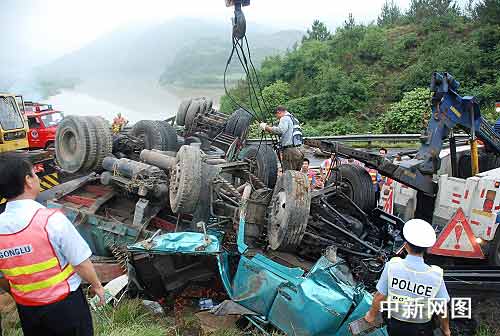 因大掛車(chē)四腳天,三名人員被死死的壓在了車(chē)內(nèi),而駕駛室已經(jīng)完全變形,消防官兵的救援器材根本派不上用途。指揮員馬上與現(xiàn)場(chǎng)的交警協(xié)商,利用交警大隊(duì)的大吊車(chē)將大掛車(chē)的車(chē)頭掉起。