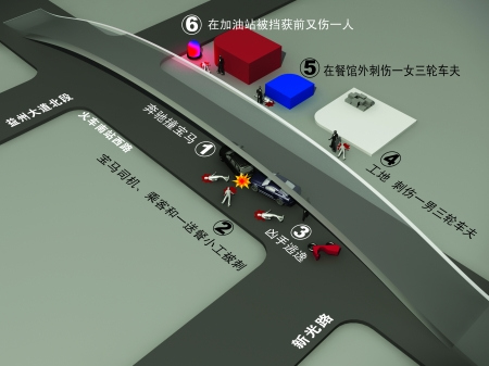 昨日中午12時(shí)許,一輛奔馳車和一輛寶馬車在(成都市)火車南站西路追尾。車禍發(fā)生后,奔馳車司機(jī)用兇器刺傷寶馬車上兩名女子和一名送餐小工。據(jù)知情人士稱,寶馬車上一名女傷者是市內(nèi)某大型家具城老板的妻子。隨后,奔馳車司機(jī)往火車南站方向跑去,一路上,先后刺傷了兩名火三輪司機(jī),最后跑進(jìn)距現(xiàn)場100多米的加油站,在刺傷一人后,被眾人合力捉住。