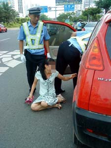 女子見搶不回駕駛證,便開始辱罵交警。這時(shí),現(xiàn)場(chǎng)出現(xiàn)了不少圍觀的市民。就在其他交警拍照取證時(shí),該女子指著一名拍照的交警大聲喝斥“不準(zhǔn)拍照”,F(xiàn)場(chǎng)交警見狀,在請(qǐng)示上級(jí)后,決定以妨礙執(zhí)法暫扣該女子車輛,并對(duì)其進(jìn)行行政拘留。一看到交警準(zhǔn)備拔走車鑰匙,還要拘留她,該女子立即沖回自己車前,坐在地上哭鬧起來。記者留意到,車內(nèi)還有一名約10歲的男孩,男孩被這一情景嚇哭了。