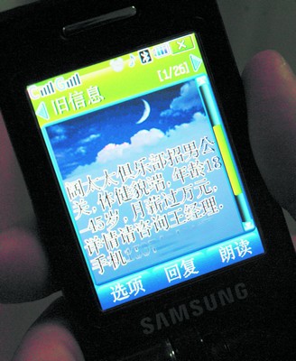 “闊太太俱樂部招男公關(guān),體健貌端,年齡18歲至45歲,月薪過萬元。詳情請咨詢王經(jīng)理,手機(jī)13×××××××××。”2008年4月20日,徐州市民張群(化名)突然收到一條招聘短信!霸率杖脒^萬元啊,有這么好的事情!睆埲杭泵仉娫掃M(jìn)行咨詢。一位自稱李經(jīng)理的人接了電話,一番詢問后,李經(jīng)理對張的條件很滿意,并約定在徐州開源名都大酒店(五星級)進(jìn)行面試!澳愕搅艘院缶偷酱髲d打我電話,我們會派人對你進(jìn)行考察!崩罱(jīng)理說。