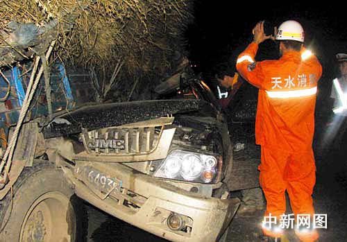 消防官兵到達現(xiàn)場后,發(fā)現(xiàn)一輛車號為川H64935的皮卡車撞進與同向行駛的一輛車號為甘E03749載有秸桿的貨車左側(cè)的后輪胎處,“皮卡”車身嚴重損壞,地面血跡斑斑。車禍致“皮卡”車上一人當(dāng)場死亡,“皮卡”內(nèi)另有兩名傷者隨即被先行趕到的120急救車送往醫(yī)院救治。