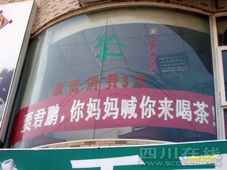再三追問(wèn)下,來(lái)自重慶農(nóng)村的陳先生如實(shí)說(shuō),他平時(shí)喜歡上網(wǎng),看到“賈君鵬,你媽媽喊你回家吃飯”這句新的網(wǎng)絡(luò)流行語(yǔ)后,一下子勾起了自己童年的回憶,想起那個(gè)時(shí)候,每天傍晚,媽媽都要喊他回去吃飯的情景。而前兩天,他在網(wǎng)上看到一張照片,重慶的一家火鍋店竟然掛出一條橫幅,上面寫(xiě)著:“賈君鵬,你媽媽喊你來(lái)吃火鍋!”他頓時(shí)靈機(jī)一動(dòng):“我為什么不能依葫蘆畫(huà)瓢,也掛一個(gè)橫幅呢?”“那為什么要寫(xiě)成‘喝茶’呢?”陳先生說(shuō):“我這是茶樓,不管飯也不管吃火鍋,打麻將倒是可以,但總不能寫(xiě)成‘賈君鵬,你媽媽喊你來(lái)打麻將’噻,所以就寫(xiě)成來(lái)喝茶了!敝劣谶@橫幅有沒(méi)有給茶樓打廣告的意思,陳先生坦言:“也許有一點(diǎn),但一來(lái)估計(jì)廣告的效果并不大,二來(lái)從自己的本意來(lái)說(shuō),娛樂(lè)的成分還要大過(guò)廣告的成分!